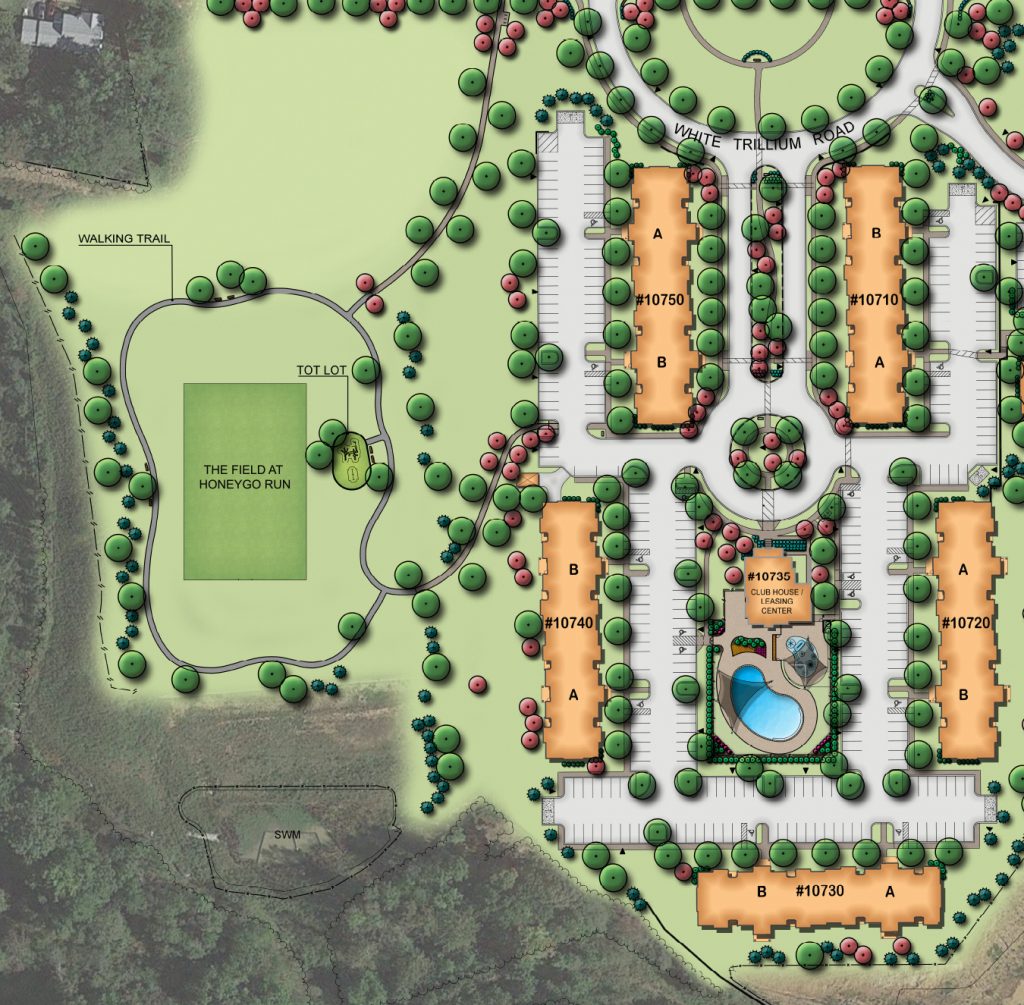 When you’re ready to go for a walk yourself, walk the dog, go for a run, or go out to play with the kids, take full advantage of The Field at HoneyGo, complete with well-tended walking trails, a large recreation field and tot lot.